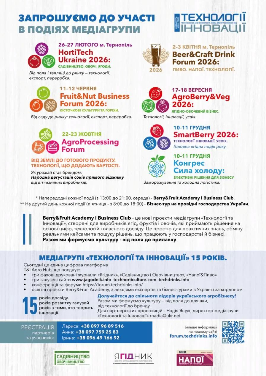 Медіагрупа «Технології та Інновації» входить у новий сезон із оновленою стратегією розвитку — створенням цифрової платформи T&I Agro Hub, що об’єднує знання, людей і події. Наші конференції, форуми та Академія Berry&Fruit стають не просто майданчиками для дискусій — це простір рішень, де український бізнес отримує інструменти для зростання. Ми зберігаємо силу друкованого слова, розвиваємо нові формати й запрошуємо вас бути частиною спільноти, яка формує аграрне майбутнє України — технологічне, відповідальне і справжнє.